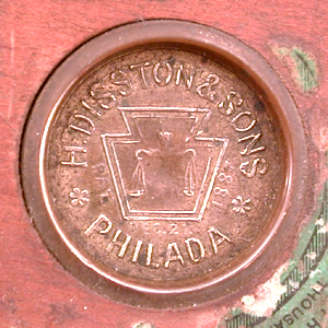 A very unusual variant. The eagle is very similar to the eagle in the medallion above, although not as refined. Of very peculiar interest is the complete spelling of the Disston's name. This is the only know medallion of this type. Due to the reduced area, "Philada" has been reduced to "Phila", with an unusual space between the last two letters.