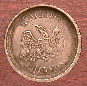 While the exact date of the transition from the earlier medallion is not known, it is reasonable to assume that Disston lost his pressing dies used for the original medallion in the fire of 1849, causing a new one to be constructed. This second generation is very similar to the first, although not nearly as refined. However, all the same main themes are present, including the olive branch and arrows. The fine ring of raised dots persist, and a pair or five pointed stars flank the eagle. Note the slightly smaller "A" in "Philada". As we shall soon see, there are many different iterations of this abbreviation.